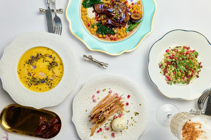 Из горячих напитков в меню представлен Раф Масала — напиток на основе эспрессо, молока с добавлением пряностей. Мильфей с шафрановым кремом и сорбетом из йогурта — это десерт La Elizabeth, посвященный дочери актрисы. Слои хрустящего невесомого теста фило с шафрановым кремом, пралине из фисташки, зерна сочного граната и терпкого соуса наршараб — сказка «1001 ночь», ставшая реальностью.