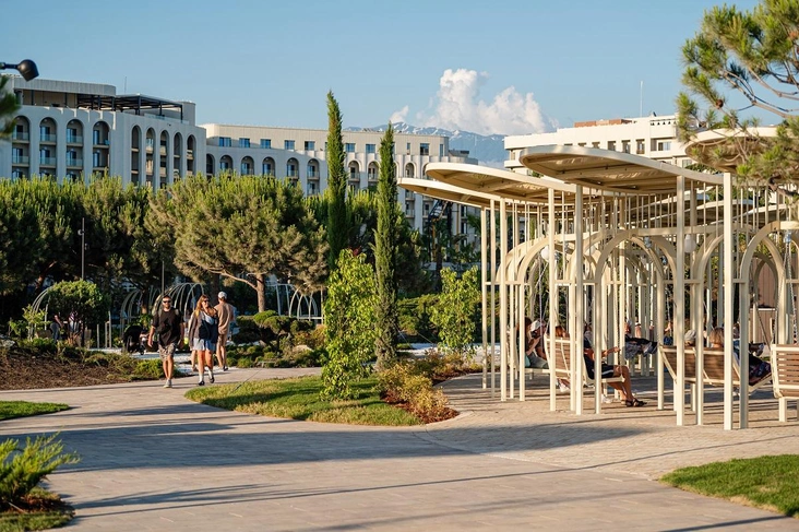 Большая территория позволяет найти все, что необходимо, в стенах комплекса: прогулочные дорожки в окружении субтропических растений, разнообразные гастропространства с авторской кухней, арт-бары, спортивный зал, двухуровневый спа-комплекс, просторная и оснащенная всем необходимым зона коворкинга.