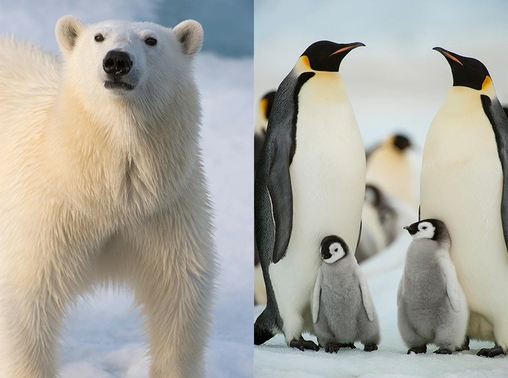 Арктика располагается ближе к нам, на севере. Более того, на ее территории постоянно проживают около 4 миллионов человек! А вот за Южным полярным кругом (Антарктика, Антарктида) жизни почти нет. Да, временами там работают ученые, но в основном здесь можно встретить разве что пингвинов (даже белых медведей тут нет — все в Арктике).
