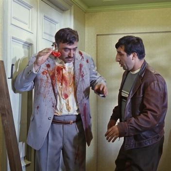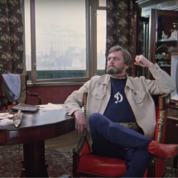В двухсерийном кинофильме Михаила Козакова один из главных героев Костик (Олег Меньшиков) приходит на свидание с возлюбленной в черном пиджаке с белым вязаным воротом и манжетами. А спустя пару мгновений, казалось бы, на той же осенней прогулке он уже одет в коричневом пиджаке и галстуке.