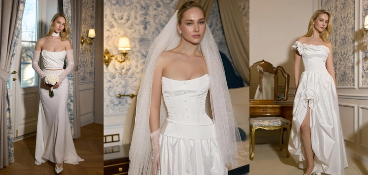 — Serment (Клятва): чистое, структурное платье с легким намеком на исторические силуэты. Идеальный выбор для торжественной церемонии, символизирующий важность и незыблемость клятвы любви.