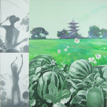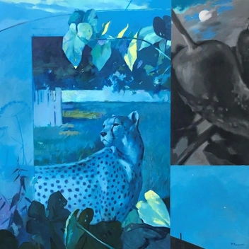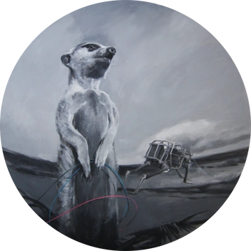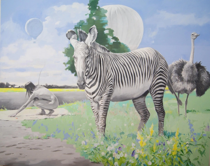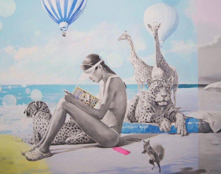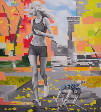 Ключевым персонажем картин художника становится женщина — в контексте выставки она предстает перед зрителем как олицетворение жизни, созданное природой. Она появляется то в естественной природной среде, то в городском пейзаже, но она всегда окружена различными умными гаджетами: над ее головой летают дроны, словно птицы, принося посылки и подарки, а на прогулке ее сопровождают робо-псы.