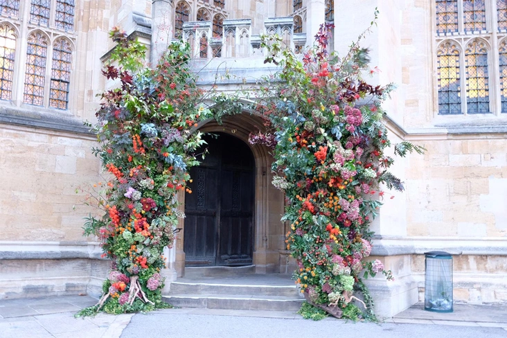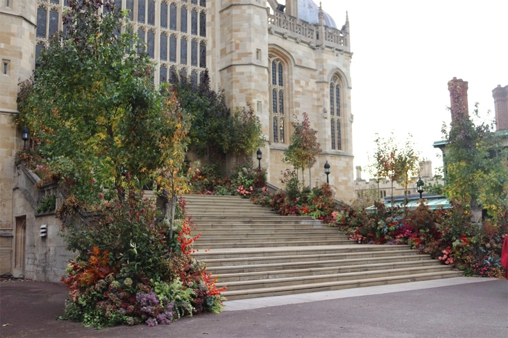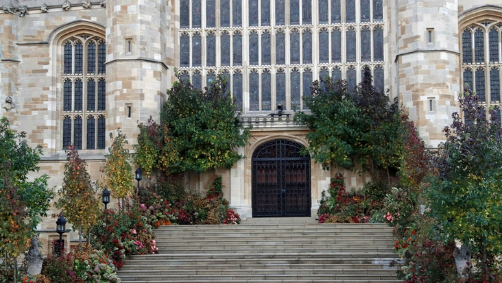 Парадный вход часовни был декорирован осенними цветами и листьями кленов. Кстати, все очень экологично, как и хотела невеста: деревья, использованные в убранстве часовни, позже будут высажены во Фрогморе (загородная резиденция Виндзоров неподалёку от замка).