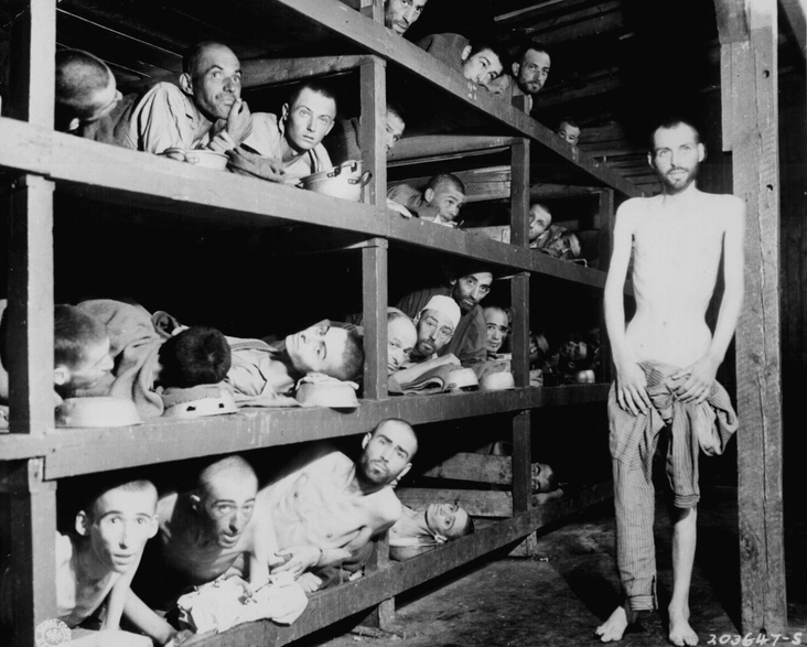 16 апреля 1945 года, всего через пять дней после освобождения американскими войсками концентрационного лагеря Бухенвальд, был сделан этот снимок. На нем — измученные заключенные, выжившие в нечеловеческих условиях. На заднем плане, на нижней полке — тяжело больной Макс Хамбургер, впоследствии ставший психиатром в Нидерландах. Во втором ряду, седьмой слева — Эли Визель, будущий писатель и лауреат Нобелевской премии мира.