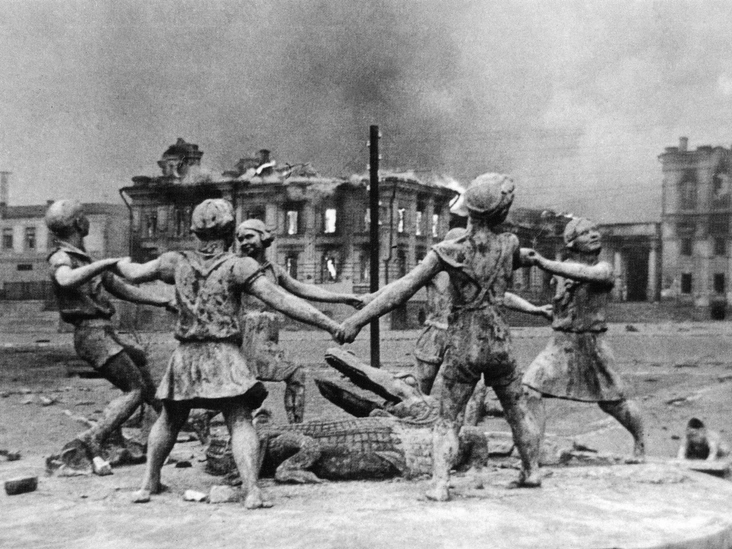 Кадр сделан 23 августа 1942 года. На фоне руин разбомбленного Сталинграда мы видим уцелевший фонтан «Детский хоровод» с танцующими детьми вокруг крокодила. Он стал трагическим символом — напоминанием о мирной жизни, разрушенной войной. После очередных боев в сентябре, скульптуры были изувечены еще сильнее: одни лишились рук и ног, другие — даже голов. С тех пор изуродованный, но все еще стоящий фонтан олицетворял стойкость города, его непокоренный дух.