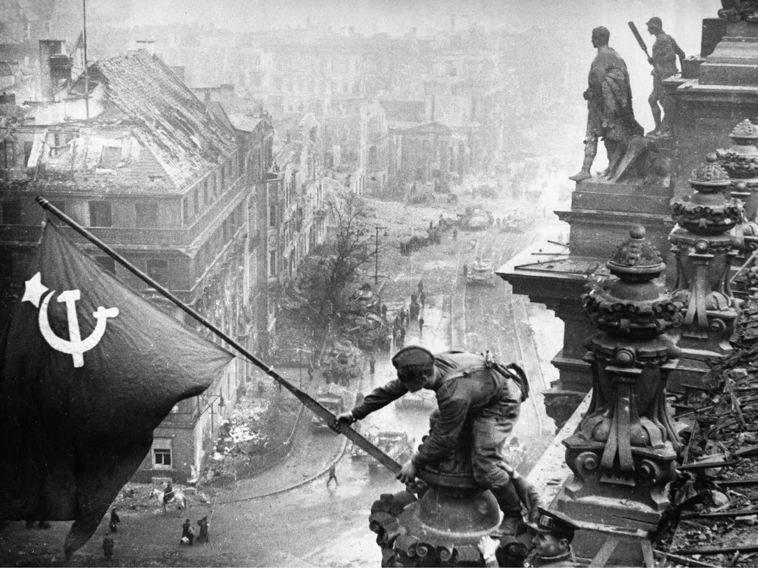 «Знамя Победы над рейхстагом» — пожалуй, самая известная в мире фотография Евгения Халдея, сделанная 2 мая 1945 года. На ней запечатлены бойцы 8-й гвардейской армии, которые водружают флаг Советского Союза на крыше здания полуразрушенного нацистского парламента после битвы за Берлин. Впоследствии это самое знамя фотограф привез с собой на родину.