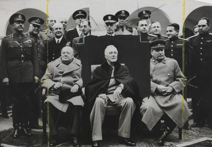 Фотография Бориса Косарева «Большая Тройка», сделанная во время Ялтинской конференции в феврале 1945 года. На этой встрече Сталин, Рузвельт и Черчилль определили мировой послевоенный порядок на долгие годы вперед. Как рассказывал фотограф: «Вначале кресло Сталина поставили в центре, но он был деликатным человеком. Посчитал ненужным злоупотребить своей ролью главного человека этой встречи, хотя и имел на это полное право».