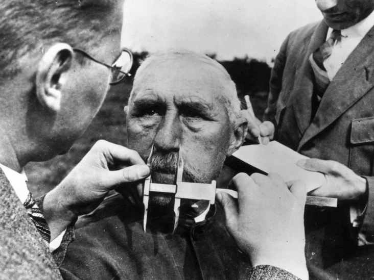 Нацистская идеология строилась на псевдонаучной иерархии рас, в которой «арийцы», особенно северные европейцы, занимали высшую ступень, а «неарийские» народы — славяне, евреи, рома — считались «Untermenschen» («недочеловеками»), угрожающими «чистоте» общества. На этой фотографии 1940 года мужчина проходит расовый тест — ему измеряют нос, чтобы определить «арийское» происхождение согласно Нюрнбергским законам.
