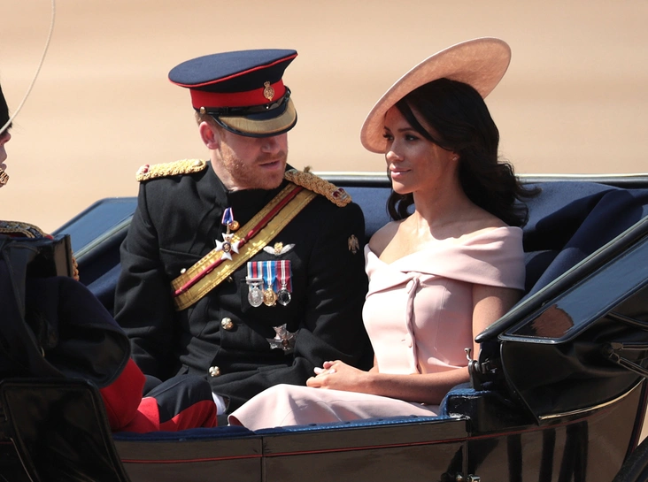 В этом году Trooping the Colour стал особенным: впервые к параду присоединилась Меган Маркл. Британская королева очень полюбила невестку, и совсем скоро герцогиня Сассекская вместе с Ее Величеством отправится в поездку в Чешир — такой чести до нее не удостаивались ни принц Уильям, ни Кейт Миддлтон. Для традиционного королевского ритуала экс-актриса облачилась в платье Carolina Herrera пастельно-розового оттенка с элегантным декольте. И, следуя дресс-коду morning dress, герцогиня Сассекская надела шляпку работы Philip Treacy.