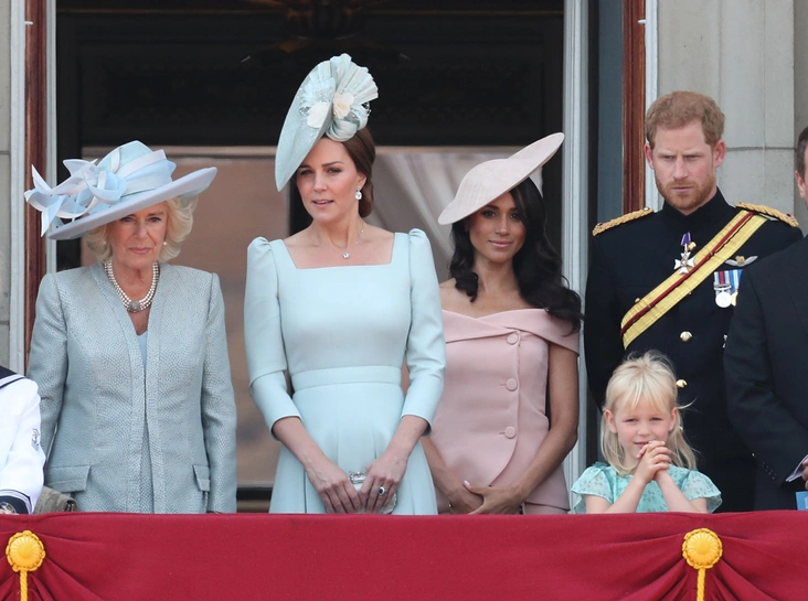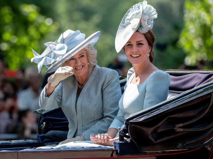 В отличие от Меган, которая проехалась в карете вместе с супругом, герцогиня Кембриджская вот уже 7-й год подряд путешествует к Букингемскому дворцу в компании с герцогиней Корнуольской, Камиллой. Женщины, по всей видимости, так привыкли к обществу друг друга на данном мероприятии, что уже даже согласовывают цветовую гамму своих нарядов. Кейт, ожидаемо, оделась в творение Alexander McQueen. А Камилла отдала предпочтение дизайнеру Bruce Oldfield, который в свое время был в чести у принцессы Дианы.