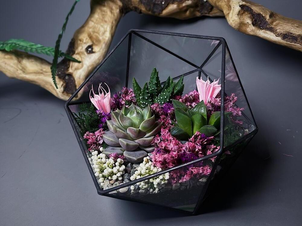 Еще один простой прием — разместить на комоде ветки эвкалипта или сухого хлопка в высокой вазе. А для украшения рабочего стола подойдет композиция из стабилизированного мха в стеклянном флорариуме.
