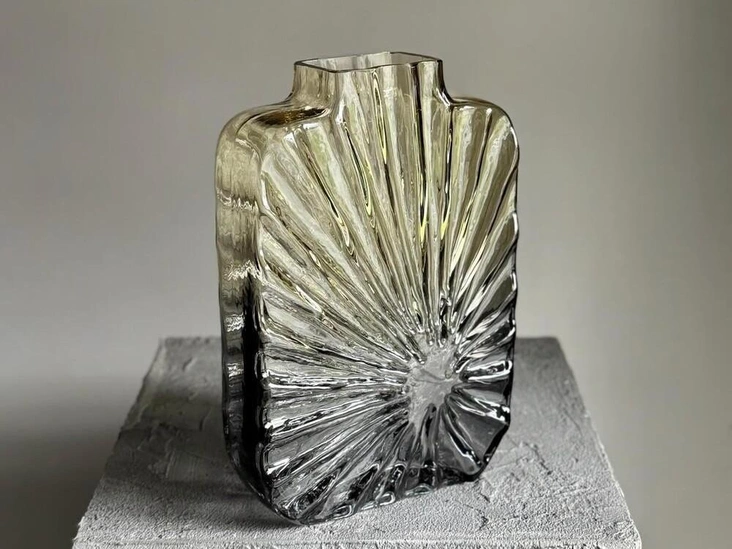 Можно собрать композицию из нескольких предметов разной высоты на консоли или обеденном столе либо остановиться на одной выразительной вазе лаконичной формы. Фактурное стекло будет выигрышно смотреться в природных оттенках: дымчато-сером, оливковом, приглушенно-янтарном и пыльно-голубом.