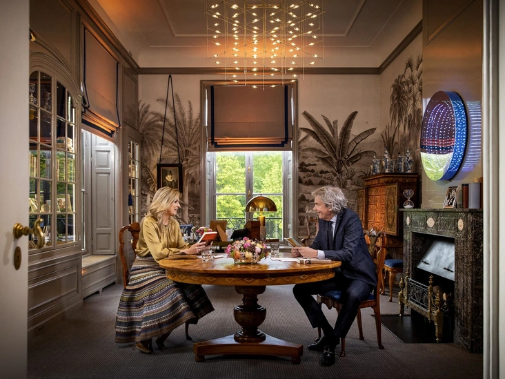 Во время локдауна королева Нидерландов дала шанс широкой публике заглянуть внутрь королевской резиденции Хёйс-тен-Бос в Гааге. Оказалось, что домашний офис уроженки Аргентины обладает неожиданной особенностью: настенными обоями в колониальном стиле с изображением пальм. С ними соседствуют классические дворцовые элементы и детали в духе ар-деко вроде золоченых ламп и римских штор. Максима была неоднократно запечатлена в эффектном кабинете, в том числе и в связи со своим 50-летием.