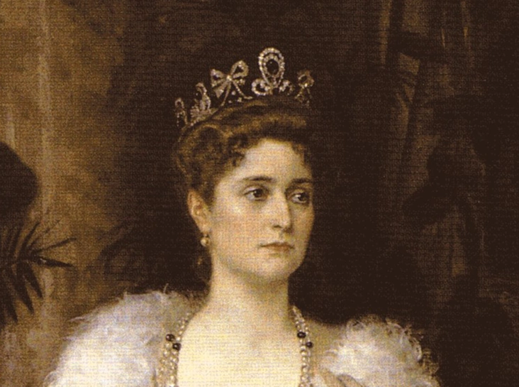 Необычная V-образная форма этой тиары относит нас к стилистике сказочной, особенно боготворимой в конце 19 века. Впрочем, сама диадема была сделана гораздо раньше — в начале 1800-х годов, и в те времена ювелиры предпочитали опираться на стиль ампир. Ее первой владелицей была императрица Елизавета Алексеевна, супруга Александра I. По свидетельству Лилии Кузнецовой, после ее смерти диадему слегка видоизменили, дабы не вызывать ассоциаций с прежней владелицей. После Революции лучистую тиару, скорее всего, продали.