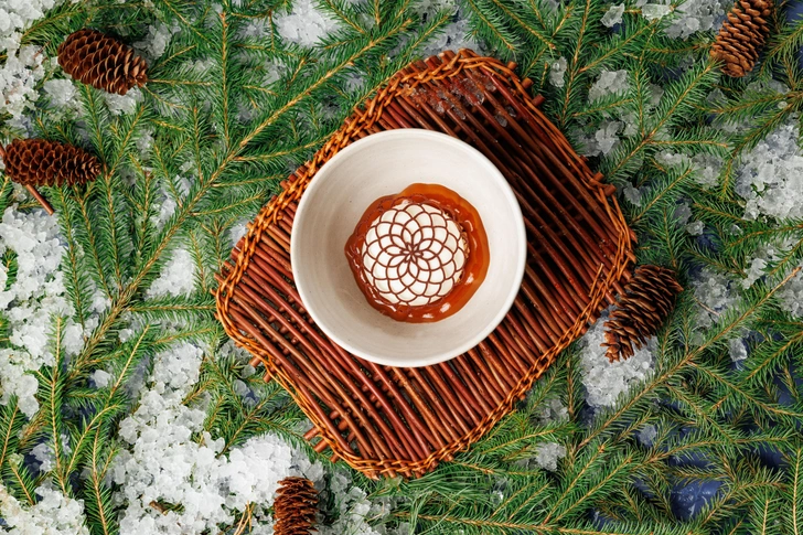 Десерты ужина — это все про игру противоположностей. Из Красноярска — нежный холодный, как сибирская зима, десерт из кефира с карамелью и кремблом из белого шоколада, украшенный ажурным «морозным» узором. Москва поддает жару остроумным «Углем» — сладким угольком с ганашем из халвы, копченой карамелью и пралине с кедровым орехом посреди большой пирамиды угля.