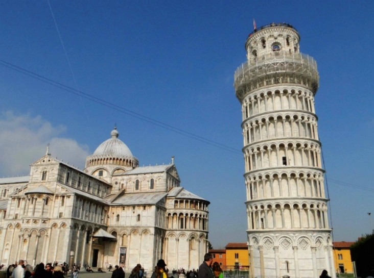 Башня известна тем, что «падает», но это еще и тонкая архитектурная работа: она построена из белого мрамора, украшена ложными арками и галереями. Угол наклона здания — 3° 54'.