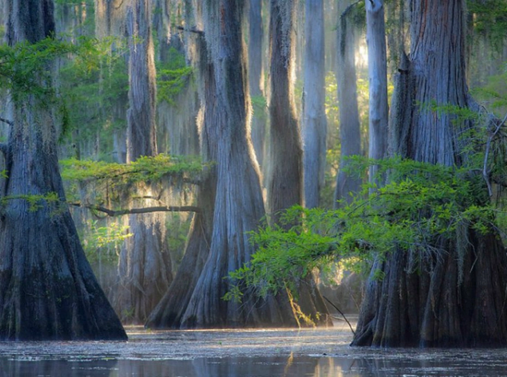 На озере Каддо в Техасе находится удивительный лес из болотных кипарисов. Листопадное хвойное дерево обожает влажность и растет прямо в воде. В течение года оно меняет цвет от нежно-зеленого до багряного и на зиму сбрасывает растительный покров.