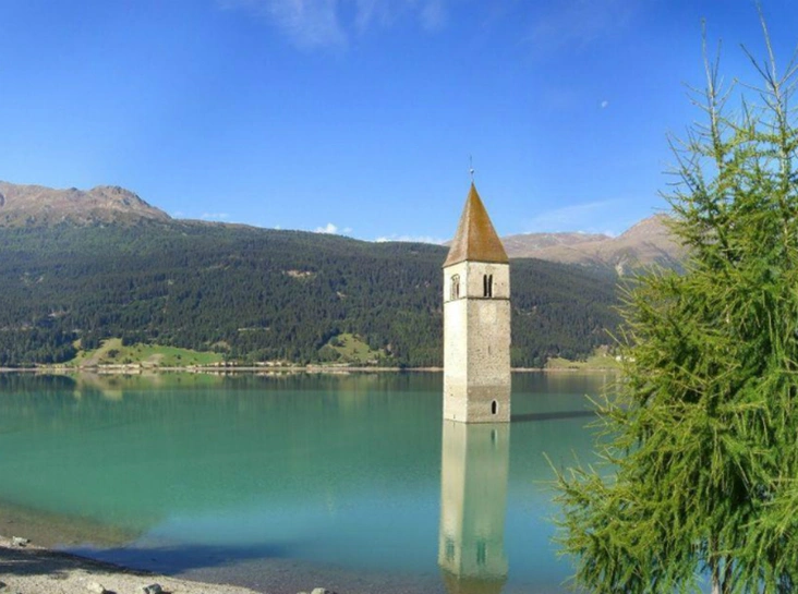 Итальянскую деревня Граун затопили в 1950 году из-за того, что местной электрической компании нужно было построить дамбу. Жители не смогли отстоять родные дома, и о поселении осталось единственное напоминание — возвышающаяся над поверхностью воды башня церкви. В ветреную погоду на берегу озера слышно, как звонят колокола.