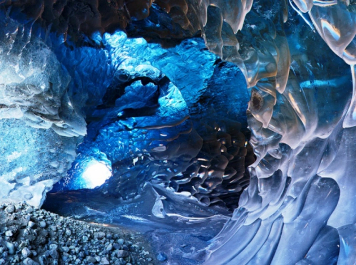 Скафтафелл в Исландии — нерукотворное дизайнерское произведение. Внутренняя поверхность пещеры покрыта причудливыми ледяными узорами, сквозь которые проходит яркое синее свечение. Спустившись в пещеру, оказываешься в кристальном сказочном мире.