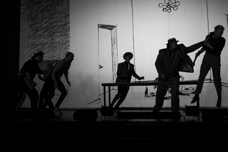 Действие на протяжении всего спектакля черно-белое и помещено на авансцену, как будто мы смотрим старый фильм. А в финале мы открываем всю театральную глубину и вводим яркие цвета. Тогда возникает эффект масштаба — и пространственного, и действенного, и цветового. Эффект эмоционального выхода из экрана в реальность. И движение марширующей перед глазами истории затягивает тебя внутрь, как бесконечный кадр Нильсена».