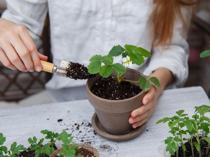 Галька или гравий. Они будут впитывать лишнюю воду на дне горшка, чтобы корни клубники не сгнили.