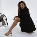 Да, мы снова элегантно сидим, но несколько иначе. Опора — на бедре и руке, которая упирается в сидение. Тело развернуто к камере, а ноги сложены друг на друге и направлены вбок. Важно: не приклеивайте их друг к другу. Согните верхнюю ногу чуть сильнее в колене и держите немного на весу, чтобы не сплющивать бедра.