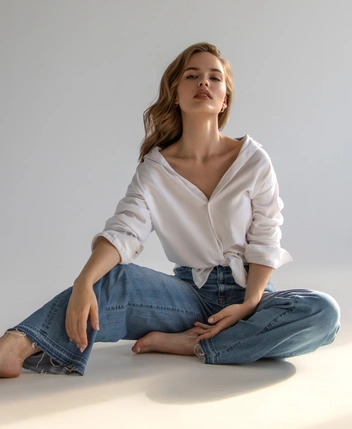 Стоя, разверните корпус примерно на 30 градусов по отношению к камере. Слегка опустите плечо и отведите назад бедро опорной ноги с той же стороны. Свободную ногу выставьте вперед — совсем немного, чтобы добавить фотографии естественности. Если снимаете в полный рост, можно поставить стопу на носочек — так получится изящнее и нога зрительно удлинится.