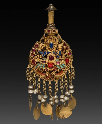 В качестве примера можно рассмотреть серьги на снимках выше, которые больше похожи на маленькие люстры. Серьги из разных комплектов, но обе были найдены в Непале. Модель справа сделана червонного золота: голубое ниелло в виде синего божества Вишну свидетельствует об индийском происхождении украшения (читайте также: Драгоценная Индия: ювелирные традиции одной из самых загадочных стран мира).