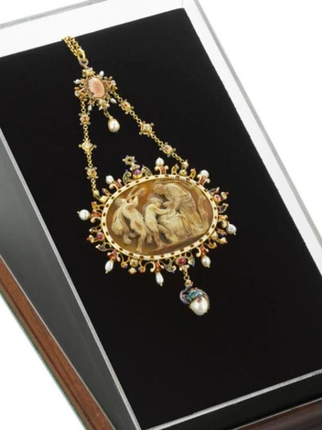 Невероятная камея неизвестного итальянского ювелира по сей день продается на аукционе за $228,500. Это кулон внушительных размеров, который был изготовлен в эпоху Позднего Возрождения. Украшение представляет собой сцену жертвоприношения, вдохновленную греко-римской историей. Центральный алтарь окружен двумя фигурами, готовящимися принести в жертву барана. В левом углу стоит человек в львиной шкуре, трубящий в рог.