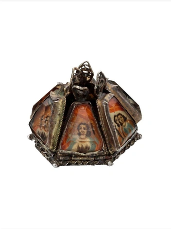 Украшение выше — испанский кулон-фонарь, раскрывающийся в форме звезды. Каждая грань украшения хранит в себе миниатюру того или иного святого, начиная от св. Екатерины и заканчивая св. Домиником. Само украшение выполнено из золота, а лики святых были нарисованы с помощью эмали. Несколько лет назад украшение неизвестного ювелира было продано на аукционе за $25,000 (читайте также: 6 самых странных вещей королевских особ, проданных на аукционах — а вы бы такое купили?).
