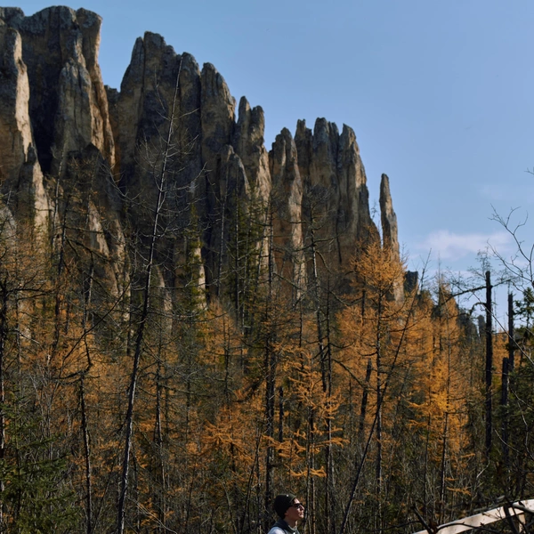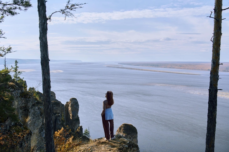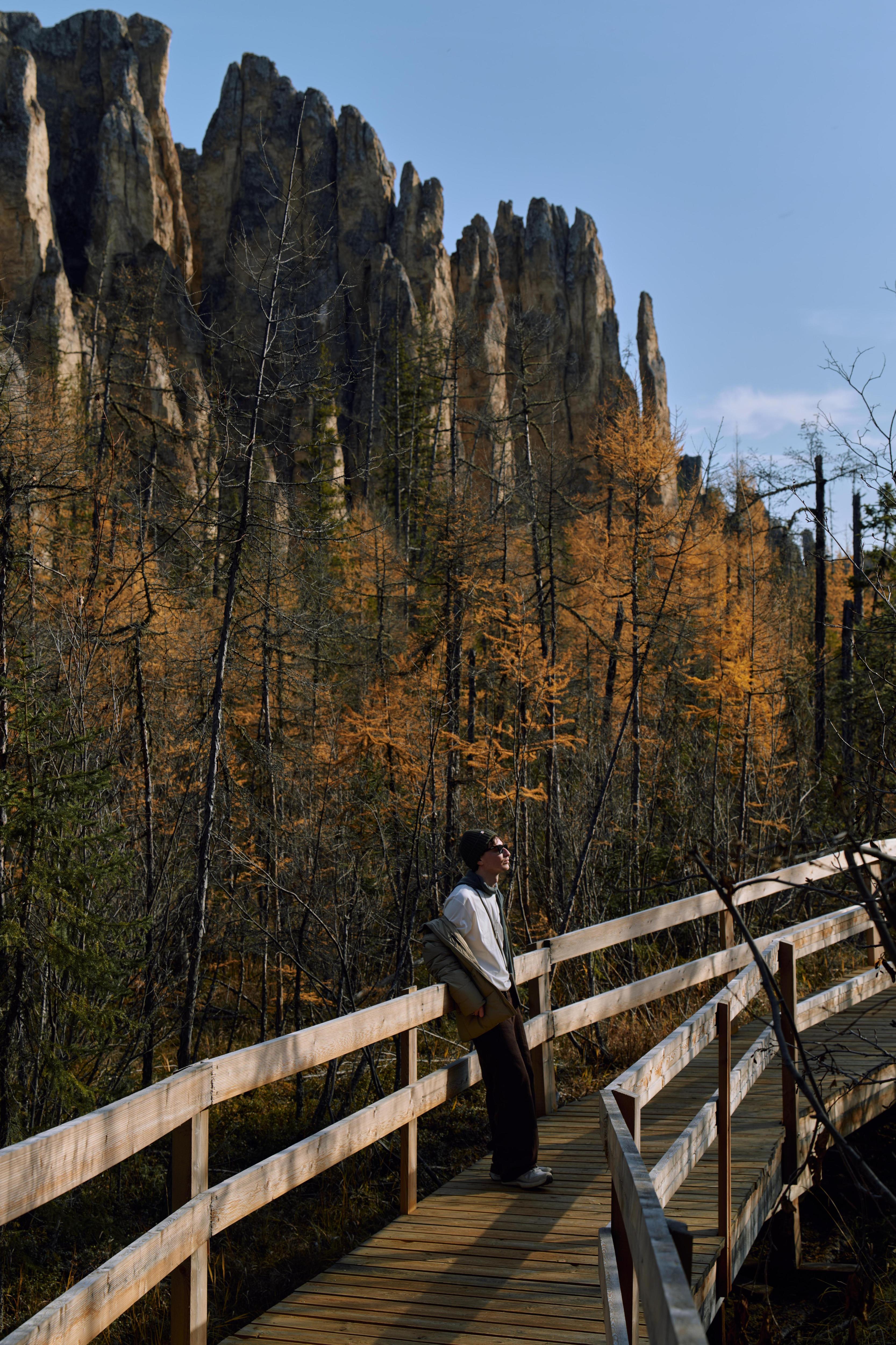 А между тем, каменные исполины то высятся в полную мощь, то вновь скрываются за деревьями, будто играют с нами в догонялки. Кульминация игры — на самом пике — звонкая тишина, еще теплый ветер с реки Лены, ласковое солнце, открытие простора для нашего внутреннего горизонта. Как будто резко протерли душевную оптику. Глядя на эти масштабы/просторы/бесконечное небо не хочется говорить о будничном, хочется просто дышать. Мое прекрасное далеко!