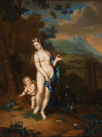 На картине изображены богиня любви Венера и Купидон. В руке у Венеры золотое яблоко, полученное в награду от Париса. То самое яблоко раздора, которое стало причиной ссоры трех богинь — Юноны, Минервы и Венеры, а впоследствии и Троянской войны. Виллем ван Мирис — представитель позднего периода «золотого века голландской живописи», один из «малых голландцев». Был деканом Гильдии Святого Луки, основал в Лейдене Академию рисунка и возродил технику «тонкой манеры», свойственную мастерам старой школы эпохи братьев ван Эйк.