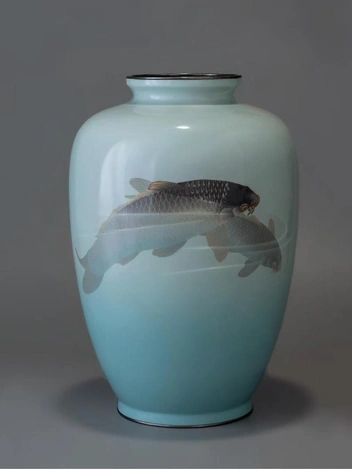 Период Мэйдзи считается «золотым веком» японских эмалевых произведений. В это время усилия местных мастеров и развитие технологических процессов привели к созданию уникального национального стиля эмальерного искусства, узнаваемого и высоко оцененного во всем мире. Ваза с карпами выполнена в одной из лучших эмалевых студий периода Мэйдзи — мастерской Андо. Она полностью покрыта голубой эмалью с переходом оттенка от светлого к темному, имитирую глубину воды. Мастера использовали сразу три техники эмалирования — перегородчатую, бесперегородчатую и объемную. По японской традиции сюжет имеет символическое значение: мирно плывущие в прозрачной воде карпы в японской традиции ассоциируются с большой удачей, гармонией бытия, счастьем и благоденствием.