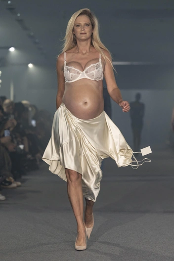 Но больше всех удивить публику в этом году смогла 44-летняя модель Кармен Касс. Она ходила по подиуму сразу двух шоу: Vetements и Christopher Esber, в рамках парижской недели моды в этом сентябре. С уже сильно округлившимся животом девушка продемонстрировала наряды из коллекций брендов, бра и атласную юбку, а также полупрозрачное платье с перьями.
