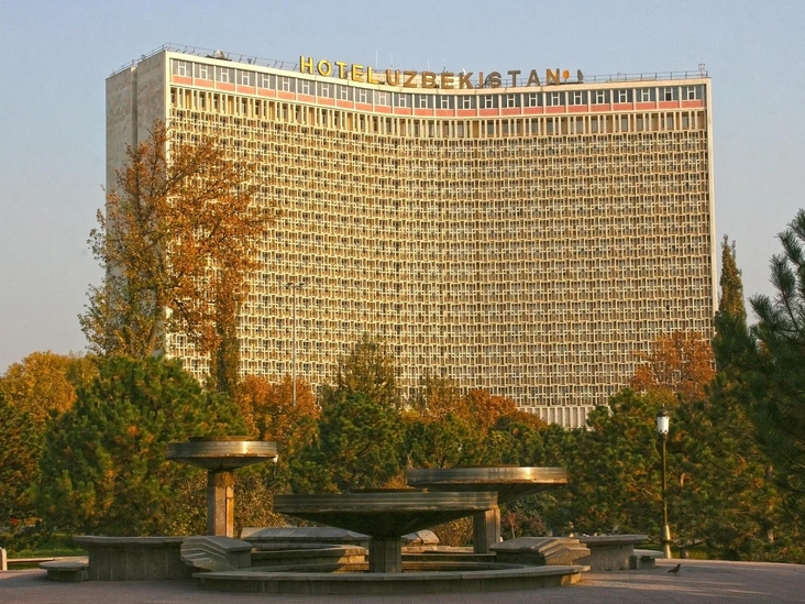 Спроектированная местным архитектором Ильей Мерпортом на рубеже 1960-1970-х годов, гостиница «Узбкистан» является еще одним важным символом столицы Ташкента, ее «витриной». Самое примечательное в этой монументальной постройке — ее необычные архитектурные формы: изогнутый фасад и декоративная бетонная решетка — панжара, которая растянулась практически во всю высоту здания. Кстати, у последней не только декоративная, но и прикладная функция: решетка закрывает окна от прямых солнечных лучей, мягко преломляя их. Благодаря этому здание выглядит по-настоящему узбекским — или даже среднеазиатским, если можно так выразиться.