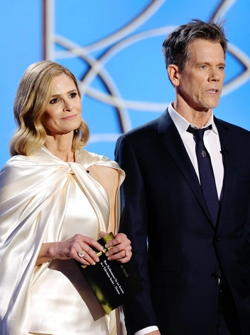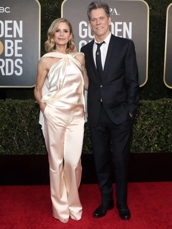 Актерская пара прибыла на церемонию в Беверли-Хиллз, чтобы со сцены объявить о том, кого премия посчитала лучшей телевизионной актрисой года. Бейкон и Седжвик с удовольствием поздравили исполнительницу роли принцессы Дианы Эмму Корин, с которой они связались по видео, с победой. 62-летний Кевин предстал перед камерами в узком черном костюме с белоснежной сорочкой и черным галстуком, дополненным эффектным зажимом-брошью. От привычных очков он отказался Его 55-летняя супруга остановила выбор на бежевом ансамбле Marina Moscone из брюк и топа с кейпообразным элементом, позволяющим оценить рельефные руки Киры.