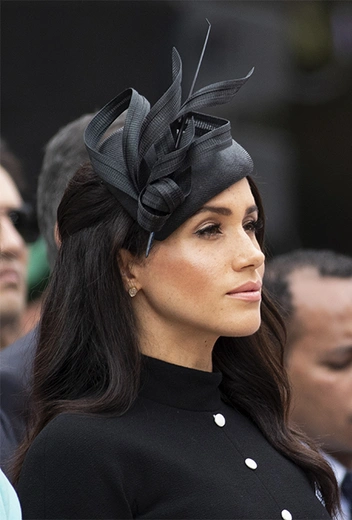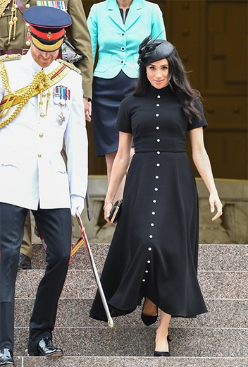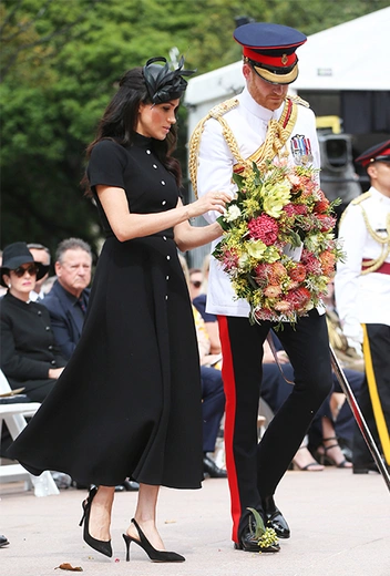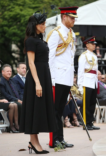 И, надо сказать, очаровываться этим утром было, с чего. Меган и Гарри, что называется, сыграли на контрасте. Принц прибыл на мероприятие в белом мундире офицера полка королевской конной гвардии Блюз энд Роялс, а Меган – в строгом черном платье Emilia Wickstead миди-длины с имитацией застежки на пуговицы от ворота до самого подола. Серьезность и официальность мероприятия, на котором также присутствовали высшие чиновники принимающей стороны, подчеркивала лаконичная черная шляпка от главного шляпника Ее Королевского Двора, Филипа Трейси. На ногах герцогини - туфли с открытой пяткой Tabitha Simmons.