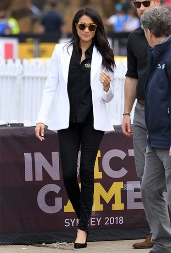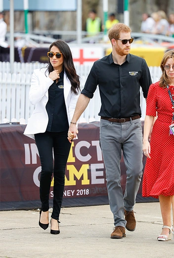 И снова Сассекские сыграли на черно-белом контрасте. На обоих – черные футболки с символикой Игр непокоренных, однако Гарри дополнил свой образ серыми брюками, тогда как Меган предпочла усилить контраст черными скинни-джинсами бренда Mother Denim (ничего общего с марками одежды для беременных у этого бренда нет) и белым блейзером Altuzarra. Переобуваться герцогиня не стала, оставшись в тех же туфлях Tabitha Simmons. Погода в субботнем Сиднее солнечная (там сейчас полным ходом идет весна), так что, Гарри и Меган предпочли не щуриться, а воспользоваться солнцезащитными очками. Отметим, что Меган в очках Illesteva выглядела как заправская кинозвезда скорее, чем как член королевской семьи. Хотя, начиная с Грейс Келли, эти понятия изрядно перемешались.