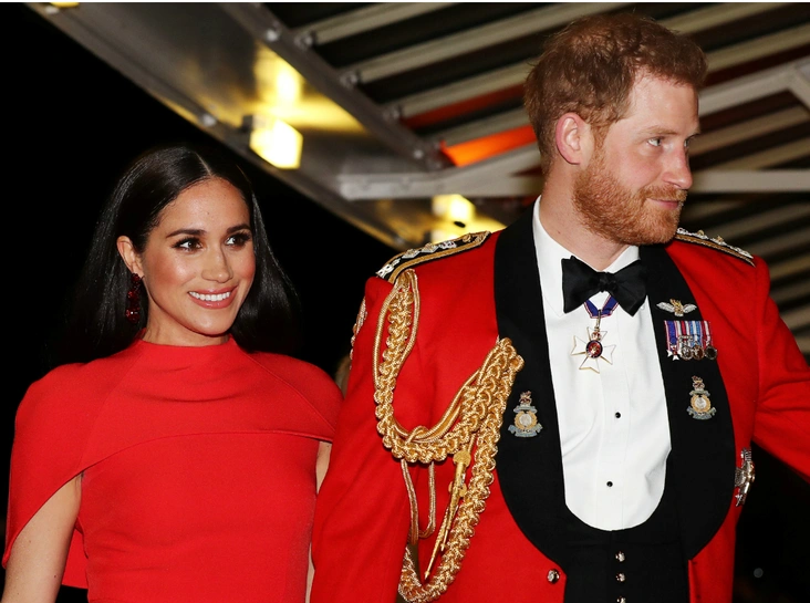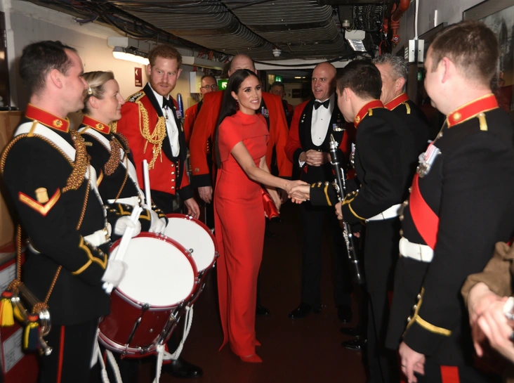 Вчера королевская пара побывала на музыкальном фестивале военных оркестров Королевской морской пехоты в Альберт-Холле, и поклонники были восхищены парным образом герцогов Сассекских — принц Гарри выбрал для мероприятия алую форму генерал-капитана морской пехоты, а Меган облачилась в роскошное платье-кейп Safiyaa в тон костюма супруга, дополнив образ атласным клатчем Manolo Blahnik и лодочками марки Aquazurra.