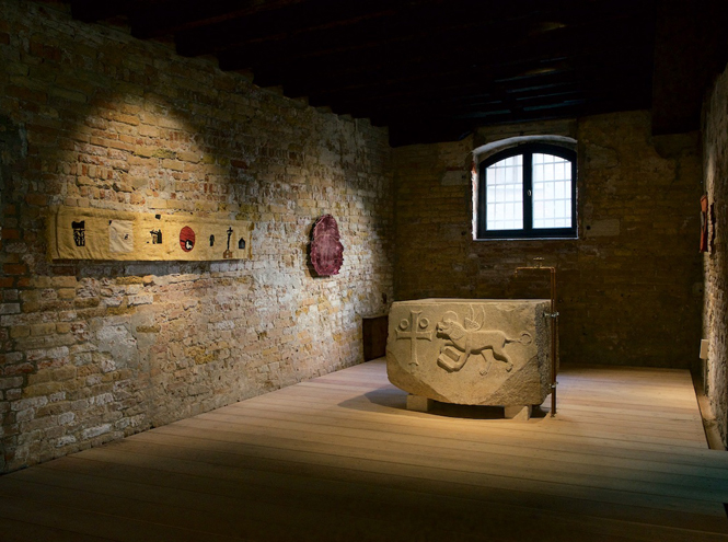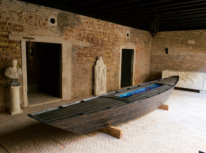 Первый этаж Палаццо заполнен образами, связанными с водой. Здесь можно встретить лодку Фабрицио Плесси как символ слияния природной и цифровой стихий. Инсталляция Татьяны Ахметгалиевой затягивает в бесконечный водоворот образов: бушующая стихия, пение сирен, далекие маяки, напоминающие о бесплотности надежд. Художник Дмитрий Булныгин обращается к экстремальному сценарию, когда человек не имеет возможности как бы то ни было контролировать внешние обстоятельства. В работах Ирины Затуловской на первый план выходит покаяние, возвращение домой и возвращение к самому себе.