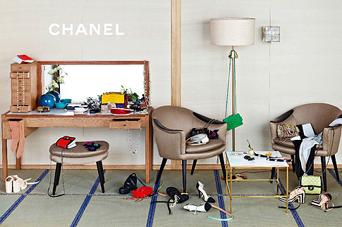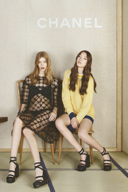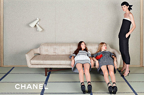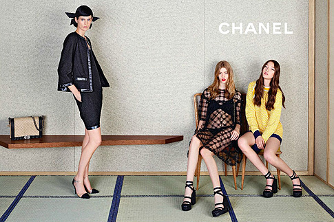 Юные модели составили органичное трио с любимицей Карла Лагерфельда – британской моделью Стеллой Теннант, которая более 15 лет снимается в рекламных кампаниях Chanel. Девушки примерили весеннюю коллекцию в интерьерах японской чайной комнаты, которая по задумке Лагерфельда превратилась в их семейный будуар, по-восточному лаконичный и сдержанный. На одном из снимков девушки лежат на традиционном низком японском столе, как палочки хаши, удерживая голову на сумках Chanel. В другом кадре модели лежат на приземистом диване в нарочито кукольных позах, вытянув вперед ноги.