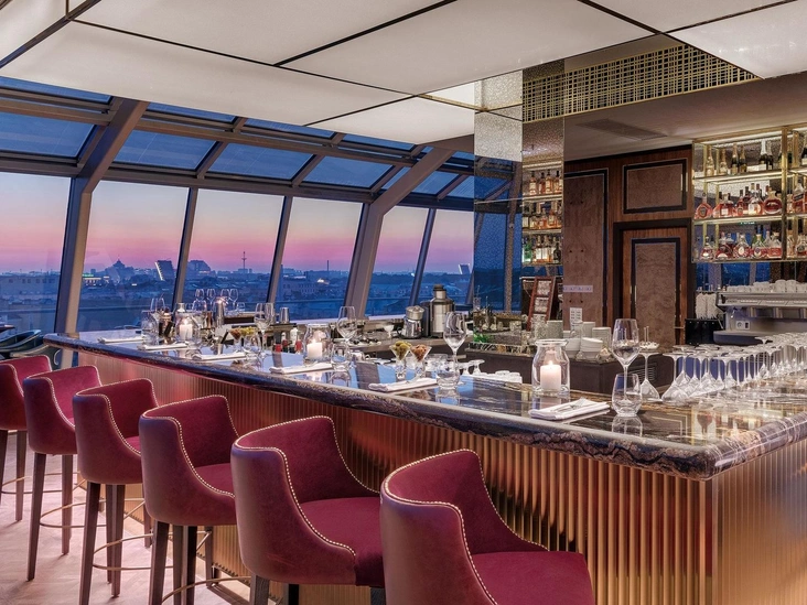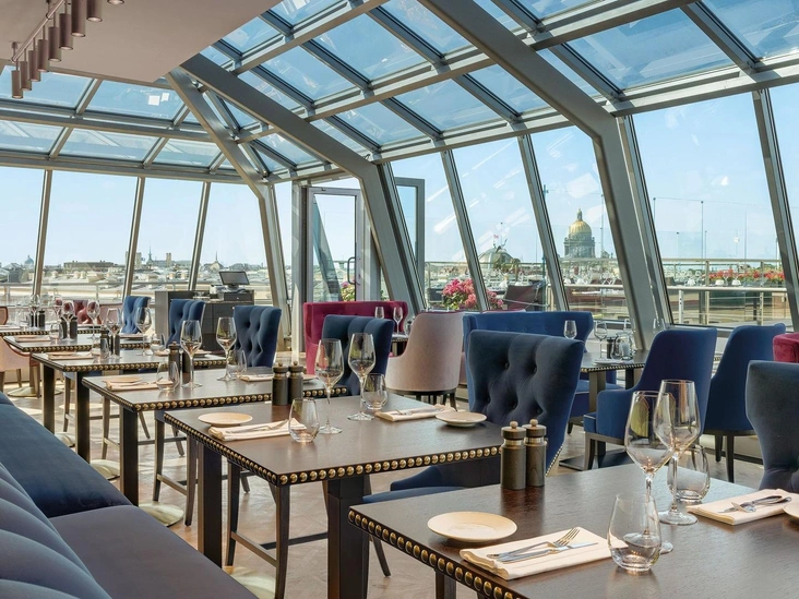 И конечно же, нужно отметить, что ужин пройдет в панорамном ресторане Bellevue, из которого открывается один из самых впечатляющих видов на исторический центр Санкт-Петербурга и его главные символы — Эрмитаж и Дворцовую площадь, Исаакиевский собор, Спас на Крови, Петропавловскую крепость. Ресторан дарит уникальную возможность любоваться городскими пейзажами во всех гостевых зонах пространства благодаря 360-градусному обзору. Интерьер оформлен лаконично, но в то же время очень элегантно, а большинство деталей пространства выполнено из темного мрамора и дерева. Гости определенно оценят контраст золотых, сапфировых и сливовых оттенков мебели с потрясающей панорамой за окном.