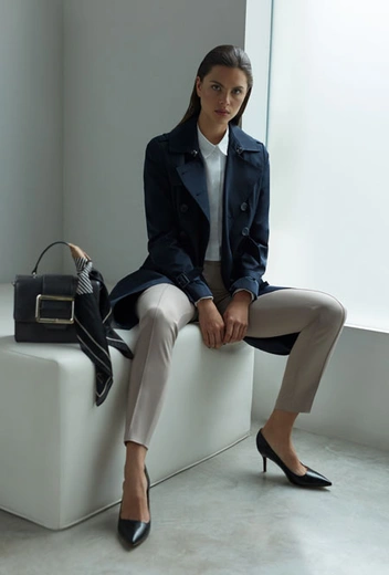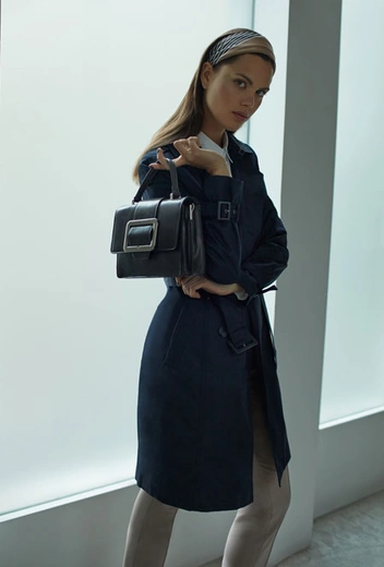 Можно собрать идеальный офисный образ, но испортить все впечатление несуразной верхней одеждой. Здесь нам на помощь приходит тренч – вне работы он отлично сочетается не только с платьями, но и с джинсами и кроссовками, а в будние легко дополнит классическое платье-футляр или костюм. Безупречность бежевого тренча переоценить невозможно, а тем, кто предпочитает альтернативные палитры, на помощь придет насыщенная гамма темно-синего.