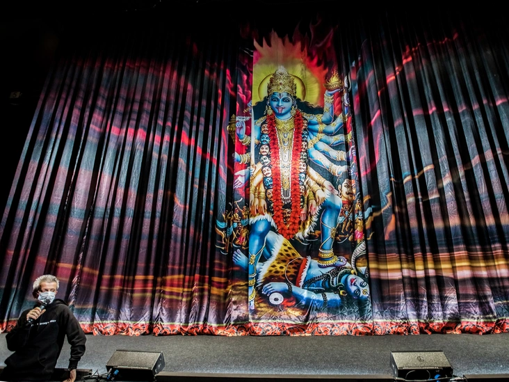 Сценография. Лариса Ломакина — великолепный художник. Минимальными средствами она создала невероятно красивый мир Достоевского. Взять хотя бы наш занавес с изображением богини Кали. И, конечно, все уже слышали, что наши костюмы были предоставлены ЦУМом. Поэтому эстетическое удовольствие от спектакля обеспечено.