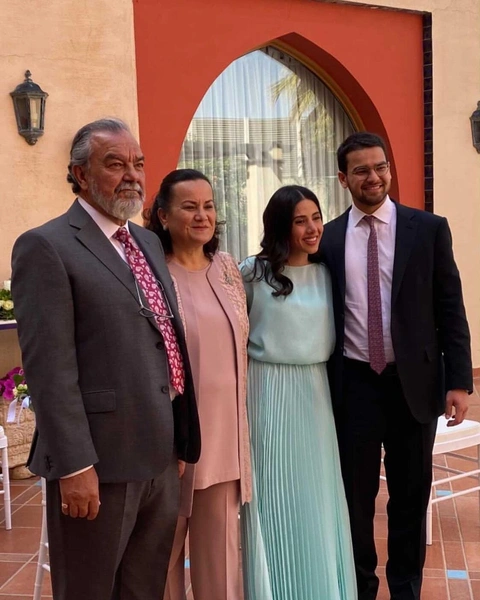 На свадебных снимках пара предстает в чуть более консервативном виде. На женихе черный костюм и белая рубашка, а вот невеста облачена в длинное светло-бирюзовое платье с плиссированной юбкой, а ее волосы покрыты полупрозрачным платком в тон. На фотографиях также можно увидеть родителей молодоженов.