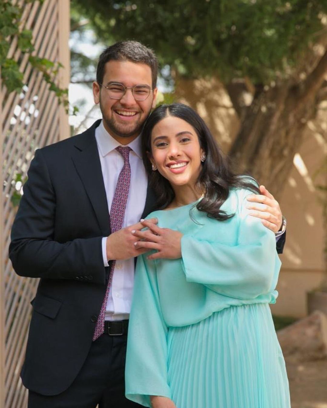 На помолвочных фотографиях Шарифа Фарах Насер Аллухаймак предстает в белом платье на запахе с небольшим воланом и подчеркнутой талией, дополненном лаконичными украшениями. Его Высочество, облаченный в синий костюм с фиолетовым галстуком, стоит рядом с возлюбленной и улыбается.
