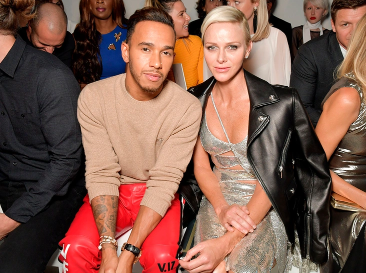 Компанию на показе Ее Светлости составил гонщик Формулы 1 Льюис Хэмилтон. Спортсмен также проникся бунтарским духом, которым в свое время славился модный дом Versace, и выбрал для появления на шоу красные кожаные брюки в паре с массивными ботинками.