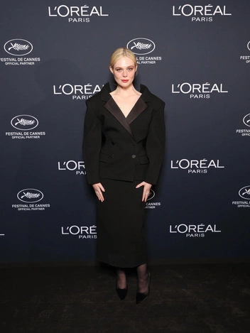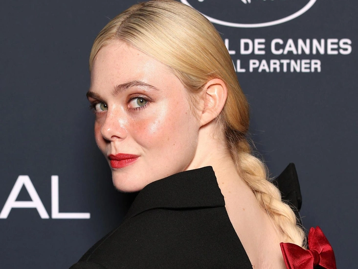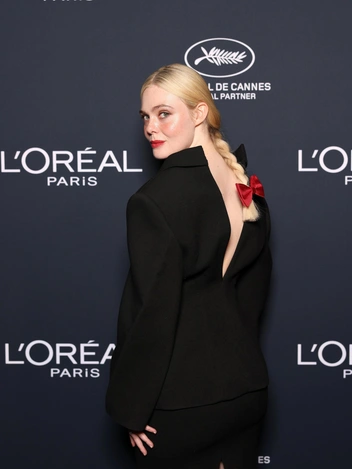 Американская актриса Эль Фаннинг прибыла в необычном двубортном платье свободного покроя. Наряд отличался открытой спиной благодаря разрезу по центру. Изюминкой образа стал красный бант, который украшал белую косу актрисы.