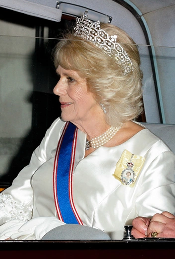 70-летняя Камилла появилась в тиаре Boucheron – украшение из коллекции Ее Величества, доставшееся монархине по наследству от матери. Тиара была создана ювелирами Boucheron в 1921 году по заказу британской аристократки Маргарет Гревиль, близкой подруги королевы Мэри. У дамы не было наследников, и она завещала украшение королеве Елизавете.