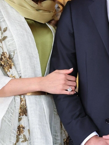 Хуссейн надел на безымянный палец избранницы эффектное кольцо с центром каплевидной формы. На невесте был светлый ансамбль с золотистым декором, на некоторых снимках дополненный светло-зеленым шарфом. На других же Раджва спокойно позирует без платка, демонстрируя аккуратные каштановые локоны.